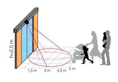 Colocado en la parte superior de una puerta automatizada, permite la detección de movimiento o presencia de una persona o vehículo en la zona de detección, enviando un contacto libre de tensión al automatismo que abre la puerta sin necesidad de tocar ningún dispositivo o superficie.